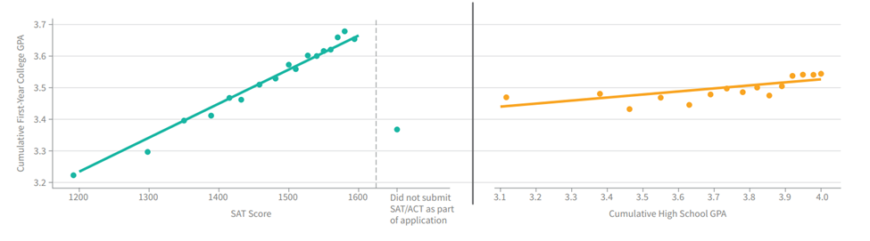 The Ivy Plus study conducted by Raj Chetty and other researchers from the Opportunity Insights group found that for the Ivies plus Chicago, Stanford, Duke, and MIT, standardized test scores were much better than high school grades at predicting collegiate academic performance. The results of their analysis were striking.