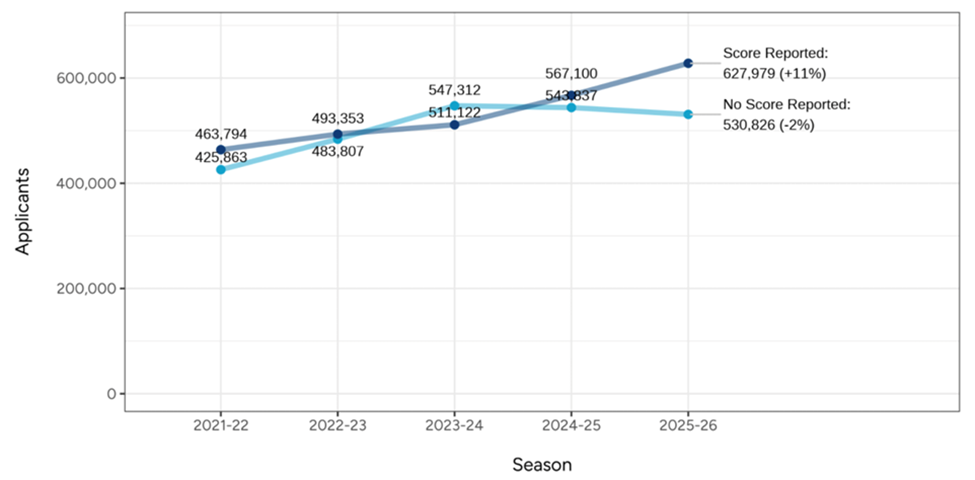 The vast majority of US colleges, over 2,000, are test-optional. The Common App reports that only 5% of member colleges require test scores. But test score submission is on the rise at selective and highly desirable schools. In 2025, seven selective schools announced a return to testing requirements: Miami (58,000+ applicants), Penn (65,000), OSU (88,000), Carnegie Mellon (34,000), Auburn (55,000), Princeton (42,000), and Alabama (58,000). That equates to some 400,000 apps that will include test scores. In 2024, Yale, Brown, UT, Harvard, Caltech, Cornell, Stanford, and Johns Hopkins reinstated testing requirements, resulting in an additional 400,000 apps. As the Common App data shows us, test-score submitters are rising, while non-submitters are falling.
